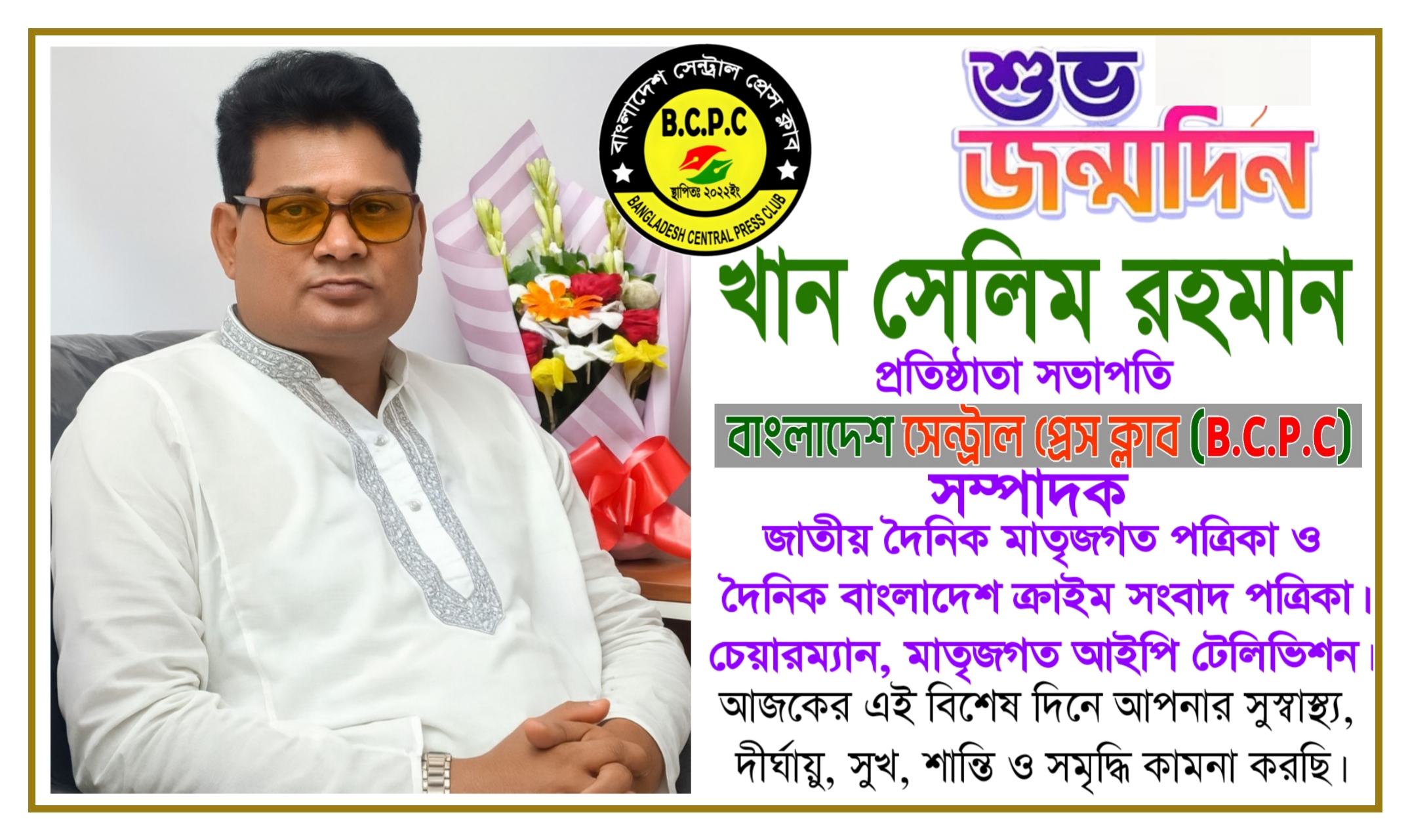 নিজস্ব প্রতিবেদক:- আজ ১১ ডিসেম্বর ২০২৫। বাংলাদেশ সেন্ট্রাল প্রেস ক্লাব (B.C.P.C)-এর প্রতিষ্ঠাতা সভাপতি,জাতীয় দৈনিক মাতৃজগত পত্রিকা ও দৈনিক বাংলাদেশ ক্রাইম সংবাদ পত্রিকার সম্পাদক, মাতৃজগত আইপি টেলিভিশন–এর চেয়ারম্যান দেশবরেণ্য সংগঠক, গণমাধ্যম উন্নয়নের অন্যতম পথিকৃৎ এবং মানবতার ফেরিওয়ালা খান সেলিম রহমানের ৪৮তম শুভ জন্মদিন।