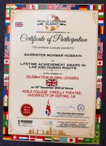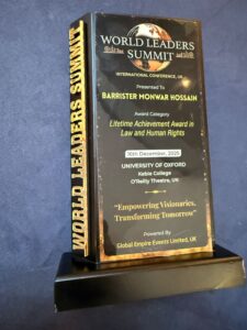 ব্রিটিশ-বাংলাদেশি বিশিষ্ট আইনজীবী বাংলাদেশের চট্টগ্রামের কৃতি সন্তান ব্যারিস্টার মনোয়ার হোসেন অক্সফোর্ড বিশ্ববিদ্যালয়ের কিবল কলেজে অনুষ্ঠিত ১৫তম ওয়ার্ল্ড লিডার্স সামিটের আন্তর্জাতিক সম্মেলনে আইন ও মানবাধিকার ক্ষেত্রে মর্যাদাপূর্ণ লাইফটাইম অ্যাচিভমেন্ট অ্যাওয়ার্ড অর্জন করেছেন। সম্প্রতি অনুষ্ঠিত এই সম্মেলন ও পুরস্কার প্রদান অনুষ্ঠানে তাঁর হাতে সম্মাননা তুলে দেওয়া হয়।