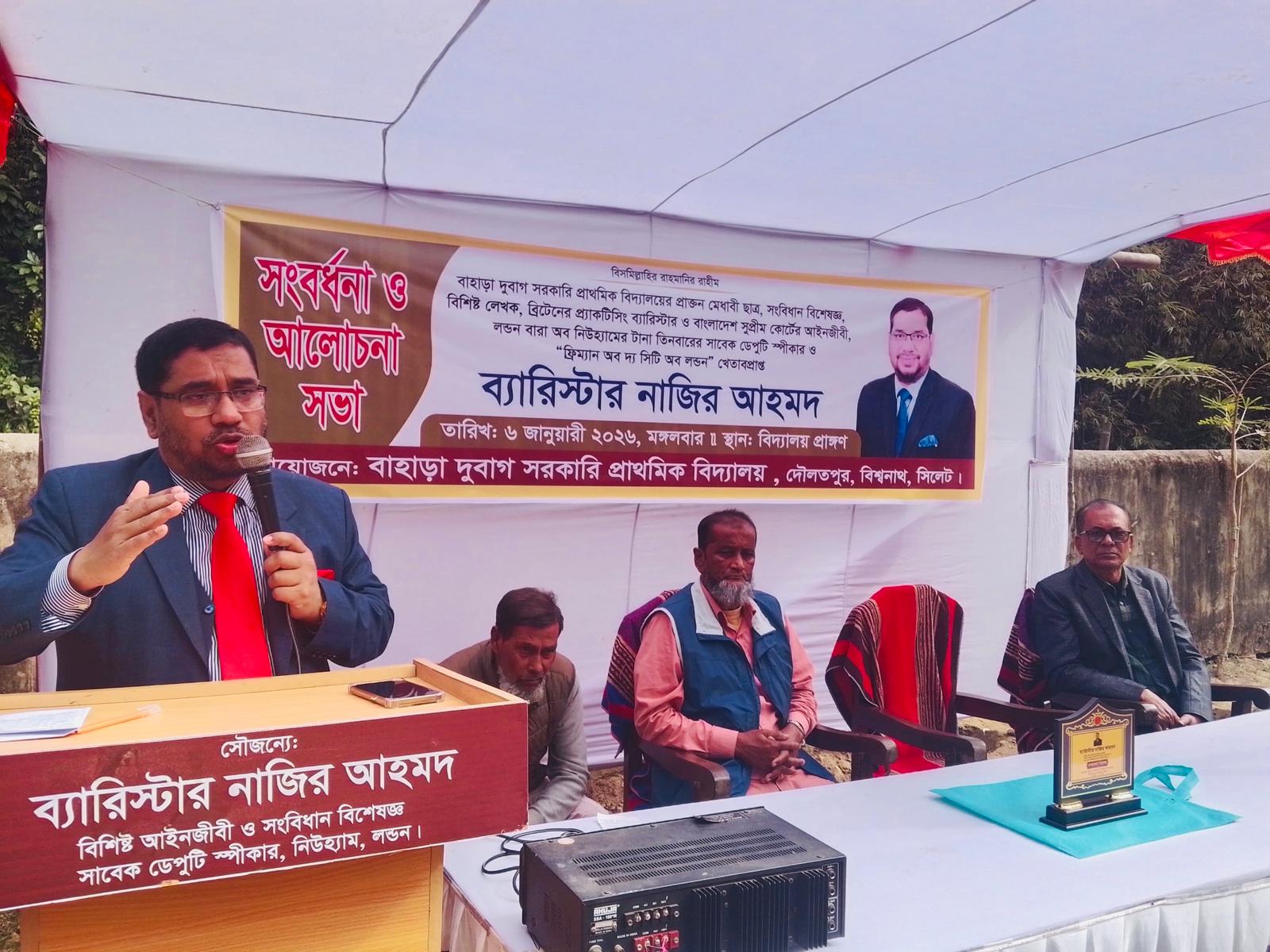 উল্লেখ্য, ব্যারিস্টার নাজির আহমদ এই স্কুলের প্রাক্তন ছাত্র ছিলেন এবং এই স্কুল থেকেই সত্তর দশকে কৃতিত্বের সাথে প্রাথমিক শিক্ষা সমাপ্ত করেন। গতকাল মঙ্গলবার ৬ জানুয়ারি দুপুরে বাহাড়া দুবাগ সরকারি প্রাথমিক বিদ্যালয়ে এসে পৌঁছলে ব্যারিস্টার নাজির আহমদকে স্কুল কর্তৃপক্ষের পক্ষ থেকে অভিবাদন জানানো হয়। এরপর প্রধান শিক্ষক করুনা কান্ত দাশের সভাপতিত্বে অনুষ্টিত হয় সম্বর্ধনা সভা। এতে বিপুল সংখ্যক ছাত্র/ছাত্রী যোগ দেন।
