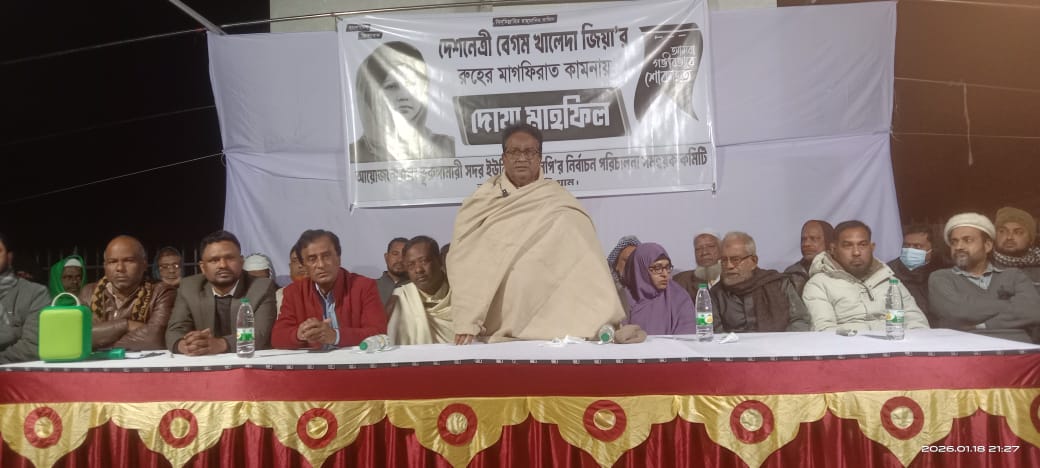 কুড়িগ্রাম জেলার ভূরুঙ্গামারীতে মুক্তিযোদ্ধা ভবনের সামনে ভূরুঙ্গামারীর সমস্ত ব্যবসায়ীদের নিয়ে মতবিনিময় ও দেশনেত্রী বেগম খালেদা জিয়ার রুহের মাগফেরাত কামনায় দোয়া মাহফিল অনুষ্ঠিত হয়েছে।