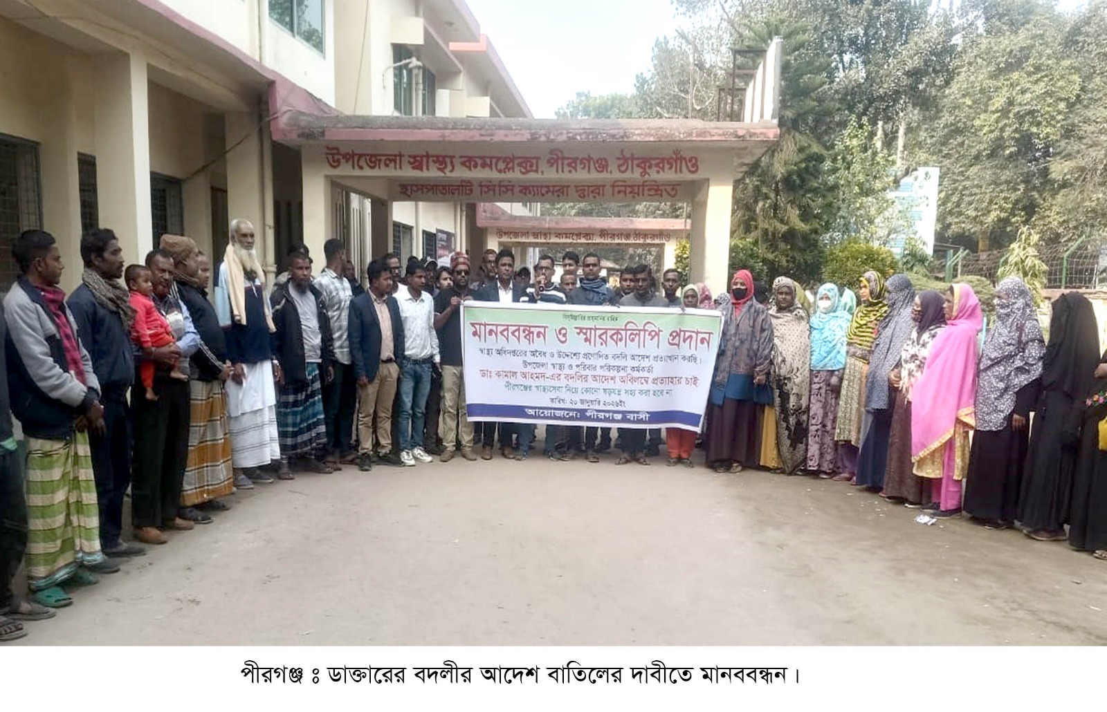 পীরগঞ্জ স্বাস্থ্য কমপ্লেক্সে ডাক্তারের বদলীর আদেশ বাতিলের দাবীতে মঙ্গলবার হাসপাতাল চত্বরে পীরগঞ্জবাসী মানববন্ধন করেছে। মানববন্ধন শেষে উপজেলা নির্বাহী অফিসারের মাধ্যমে স্বাস্থ্য অধিদপ্তরের মহা-পরিচালক সহ সরকারি বিভিন্ন দপ্তরে স্মারকলিপি প্রদান করেন। নিয়ম বর্হিরভুত ভাবে ও বদলীর নীতিমালা ভঙ্গ করে অসৎ উদ্দেশ্যে এ হাসপাতালের স্বাস্থ্য ও পঃপঃ কর্মকর্তা (ভারপ্রাপ্ত) ডাঃ কামাল আহমেদ কে রাণীশংকৈল উপজেলায় একই পদে জরুরী ভাবে বদলী করায় এলাকার আম জনতা প্রতিবাদ করা সহ ফুসে উঠেছে। জানা গেছে, ডাঃ কামাল আহমেদ প্রায় ৪ মাস পূর্বে পীরগঞ্জ স্বাস্থ্য কমপ্লেক্সে স্বাস্থ্য ও পঃপঃ কর্মকর্তা (ভারপ্রাপ্ত) হিসেবে যোগদান করেন। তিনি হাসপাতালে নিয়মিত দায়িত্ব পালন করা সহ বেশ কিছু উন্নয়ন মূলক কাজ ও রোগীদের নানামুখি সেবা নিশ্চিত করা সহ হাসপাতালকে ঢেলে সাজানোর কাজ শুরু করেছেন। ঠিক সেই মহুর্তে স্বাস্থ্য অধিদপ্তরের মহাপরিচালকের নির্দেশে বিদায়ী পরিচালক প্রশাসন ডাঃ এবিএম আবু হানিফ ২০২৬ সালে ১৪ জানুয়ারী ডাঃ কামাল আহমেদ কে পীরগঞ্জ স্বাস্থ্য কমপ্লেক্স থেকে জরুরী ভাবে রানীশংকৈল উপজেলা স্বাস্থ্য কমপ্লেক্সে একই পদে বদলী করেন। অপর দিকে পীরগঞ্জ স্বাস্থ্য কমপ্লেক্সে প্রায় ৫ বছর একটানা স্বাস্থ্য ও পঃপঃ কর্মকর্তা (ভারপ্রাপ্ত) হিসেবে কর্মরত থাকা ও হাসপাতাল নষ্ট করার কারিগর ডাঃ আব্দুল জব্বারকে প্রায় ৪ মাস পূর্বে এ হাসপাতাল থেকে ঠাকুরগাঁও আধুনিক সদর হাসপাতালে জরুরী বিভাগে মেডিকেল অফিসার হিসেবে যোগদান করার জন্যে কর্তৃপক্ষ নির্দেশ প্রদান করেন। ডাঃ আব্দুল জব্বারকে ৫ কার্যদিবসের মধ্যে ঠাকুরগাঁও সদর হাসপাতালে যোগদান না করলে তিনি চাকুরি থেকে অবমুক্ত হবেন বলে বদলীর প্রজ্ঞাপনে স্বাস্থ্য অধিদপ্তর উল্লেখ্য করেন। তিনি সেখানে যোগদান না করে স্বাস্থ্য অধিদপ্তরের মহাপরিচালক প্রফেসর ডাঃ আবু জাফর, স্বাস্থ্য মন্ত্রণালয়ের নীতিমালা শতভাগ ভঙ্গ করে পুনরায় গত ১৮/০১/২০২৬ইং তারিখে ডাঃ আব্দুল জব্বারকে এ হাসপাতালে যোগদান করার নির্দেশ প্রদান করেন। ডাঃ আব্দুল জব্বারের বদলীর ক্ষেত্রে স্বাস্থ্য অধিদপ্তর সীমাহিন অনিয়ম, দূর্নীতি, স্বেচ্ছাচারিতার প্রতিবাদে পীরগঞ্জবাসী মানববন্ধন কমীসূচীর আয়োজন করেন। মানবন্ধনে গণঅধিকার পরিষদের উপজেলা শীর্ষ নেতা প্রফেসর আব্দুস সোবহান, পৌর সভাপতি আলমগীর কবীর জুয়েল, বিএনপি’র নেতা রাসেল রাজ, যুবদল নেতা শরিফ সহ অন্যান্য বক্তব্য দেন। ডাঃ আব্দুল জব্বারের পদায়নের আদেশ বাতিল করা ও জনস্বার্থে ডাঃ কামাল আহমেদকে এ হাসাপাতালে বহাল রাখার জন্যে পীরগঞ্জবাসী সংশ্লিষ্ট প্রশাসনকে জোর দাবী জানিয়েছেন।