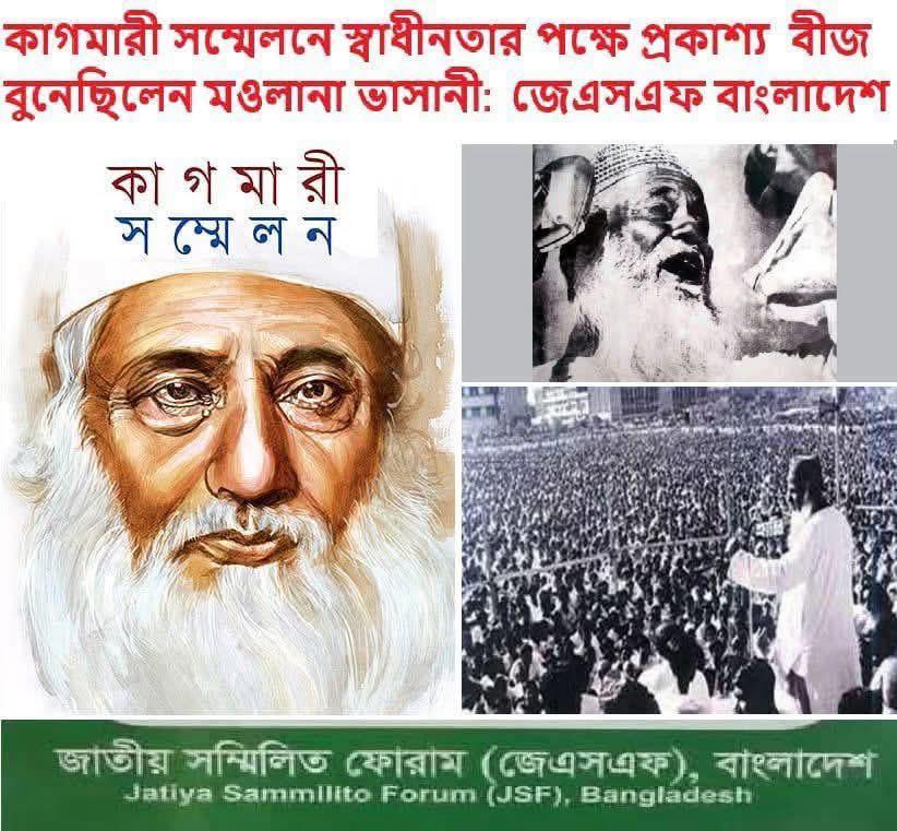 জাতীয় সম্মিলিতি ফোরাম ( জেএসএফ ) বাংলাদেশ কাগমারী সম্মেলনে দিবস উপলক্ষে ১৬ ফেব্রুয়ারি ২০২৬,এক বিবৃতিতে সংগঠক হাজী আনোয়ার হোসেন লিটন বলেছেন, মওলানা আবদুল হামিদ খান ভাসানী ১৯৫৭ সালে কাগমারী সম্মেলনে বাংলাদেশের স্বাধীনতার পক্ষে প্রকাশ্য ও রাষ্ট্র স্বাধীনতার বীজ বপন করেছিলেন মাওলানা আব্দুল হামিদ খান ভাসানী। মওলানা ভাসানী আমাদের স্বাধীনতা ও মুক্তির সংগ্রামের অবিসংবাদিত নেতা। বিগত ফ্যাসিস্ট সরকার ভাসানীর অবদান মুছে ফেলে ইতিহাস বিকৃতি করেছে। মওলানা ভাসানীর জীবন ও কর্ম যথাযথভাবে নতুন প্রজন্মের কাছে উপস্থাপন করলে জাতি উপকৃত হবে।খবর আইবিএননিউজ।