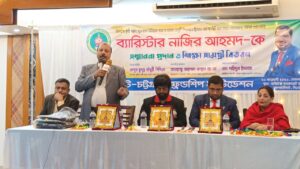 ব্যারিস্টার নাজির আহমদ আরও বলেন, বাংলাদেশ অপার সম্ভাবনাময় দেশ। রাজনীতিতে গুনগত পরিবর্তন ও স্থিতিশীলতা আসলে, দুর্নীতি বন্ধ হলে এবং জাতীয় জীবনের সব দিক ও বিভাগে শৃঙ্খলাবোধ জাগ্রত হলে দেশ পত্পত্ করে উঠে যাবে। আয়োজকদের ধন্যবাদ জানিয়ে ব্যারিস্টার নাজির আহমদ বলেন, জীবনে কত সম্বর্ধনা পেয়েছি, নিজ হাতে কত সম্মাননা দিয়েছি। তবে আজকের এটি পাওয়ার অনুভূতি সম্পূর্ণ আলাদা। বিনয়ের সাথে সম্মাননা গ্রহণ করে তিনি বলেন, দায়িত্ববোধ ও কমিটমেন্ট তা আরো বাড়িয়ে দিল। প্রকৃত সম্মান ও পুরস্কার আমি মহান স্রষ্টার কাছে চাই।
