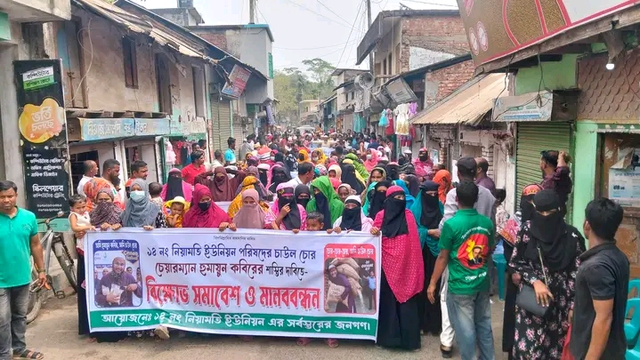স্থানীয় সহস্রাধিক বিক্ষুব্ধ নারী-পুরুষ মিছিলে অংশ নিয়ে চেয়ারম্যান হুমায়ুন কবিরের বিভিন্ন কর্মকাণ্ডের বিরুদ্ধে তীব্র ক্ষোভ প্রকাশ করেন এবং তার অপসারণ ও দৃষ্টান্তমূলক শাস্তির দাবি জানিয়ে উন্মুক্তভাবে স্লোগান দিতে থাকেন।মিছিলটি বাজারের প্রধান সড়ক প্রদক্ষিণ করে।