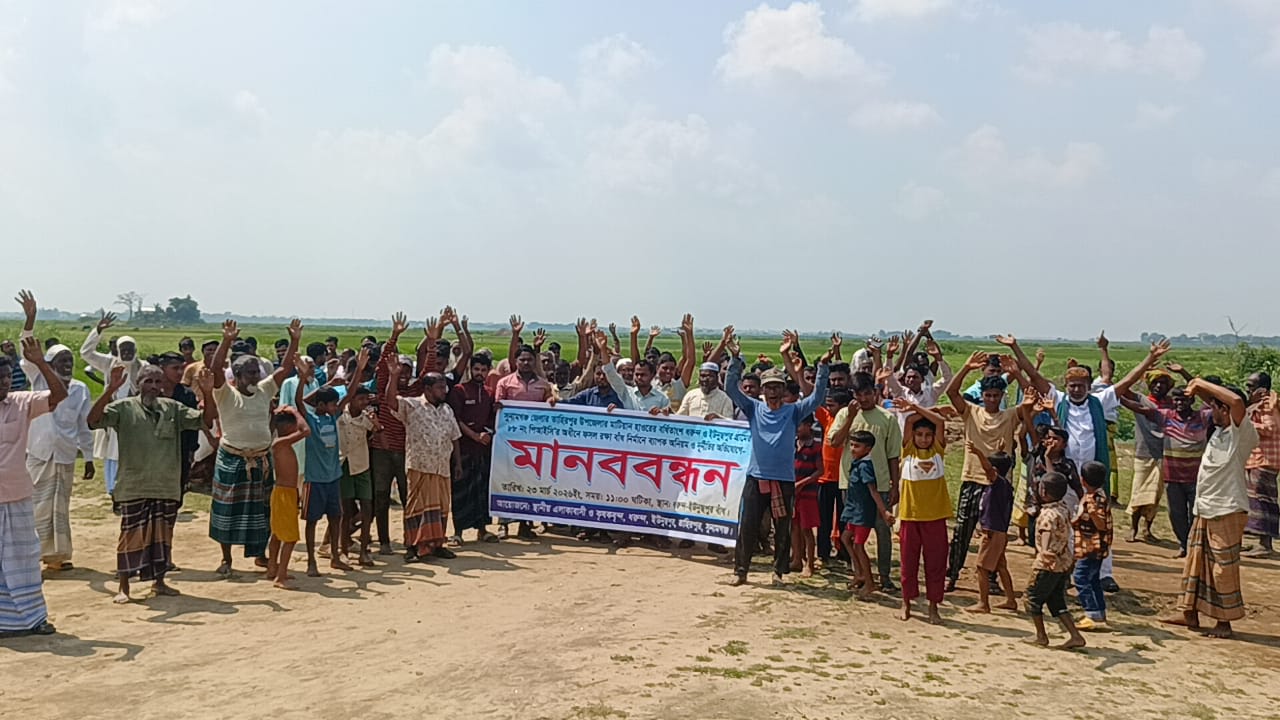 তাহিরপুরে বর্ধিত সময় পার হলেও বলদার হাওর ফসলরক্ষা বাঁধ না হওয়ায় কৃষকদের মানববন্ধ